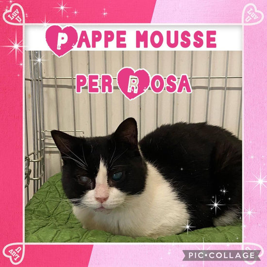 Rosa al momento mangia pappe mousse. Se volete venire a trovarci e portarle un po’ di pappe, ci sarà l’occasione anche per farle qualche coccola! Rosa è adottabile, solo in casa, perché è cieca. È molto buona e tranquilla.